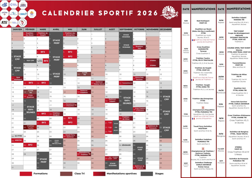 𝗢𝗨𝗩𝗘𝗥𝗧𝗨𝗥𝗘 𝗗𝗘𝗦 𝗜𝗡𝗦𝗖𝗥𝗜𝗣𝗧𝗜𝗢𝗡𝗦 Le «Duathlon FTTRI» est organisé par la Fédération Tahitienne de Triathlon, le dimanche 1er février 2026 à Motu Uta – Fare Ute. – Les épreuves proposées seront ouverts aux licencié(e)s des clubs de la FTTRI et aux non-licencié(e)s s’acquittant d’une licence journalière. Les épreuves proposées sont ouvertes aux licencié(e)s et non-licencié(e)s :…