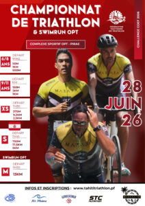 🇵🇫 Championnat de Triathlon / Swimrun OPT – Compétition fédérale organisée par la FTTRI et le MARARATRI 📍Complexe sportif de l’OPT à Pirae. Le Championnat de Polynésie de Triathlon est co-organisé par le club de Marara tri et la Fédération Tahitienne de Triathlon le dimanche 28 juin 2026 au complexe sportif de l’OPT à Pirae. – Les épreuves proposées seront ouvertes aux licencié(e)s des clubs de la FTTRI et aux non-licencié(e)s s’acquittant d’une licence journalière (sauf sur le championnat de triathlon format S) Les épreuves proposées sont : – Ouvertes aux licencié(e)s et non-licencié(e)s :