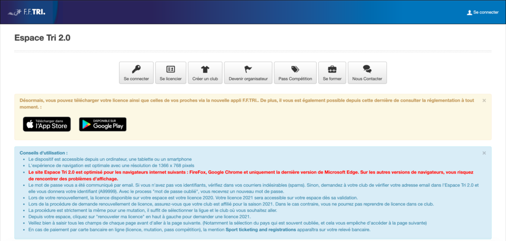 Pour prendre sa première licence, cliquer sur “ Se licencier ”. Pour renouveler sa licence, cliquer sur “ se connecter ”. Vous aurez besoin de vos identifiants personnels.