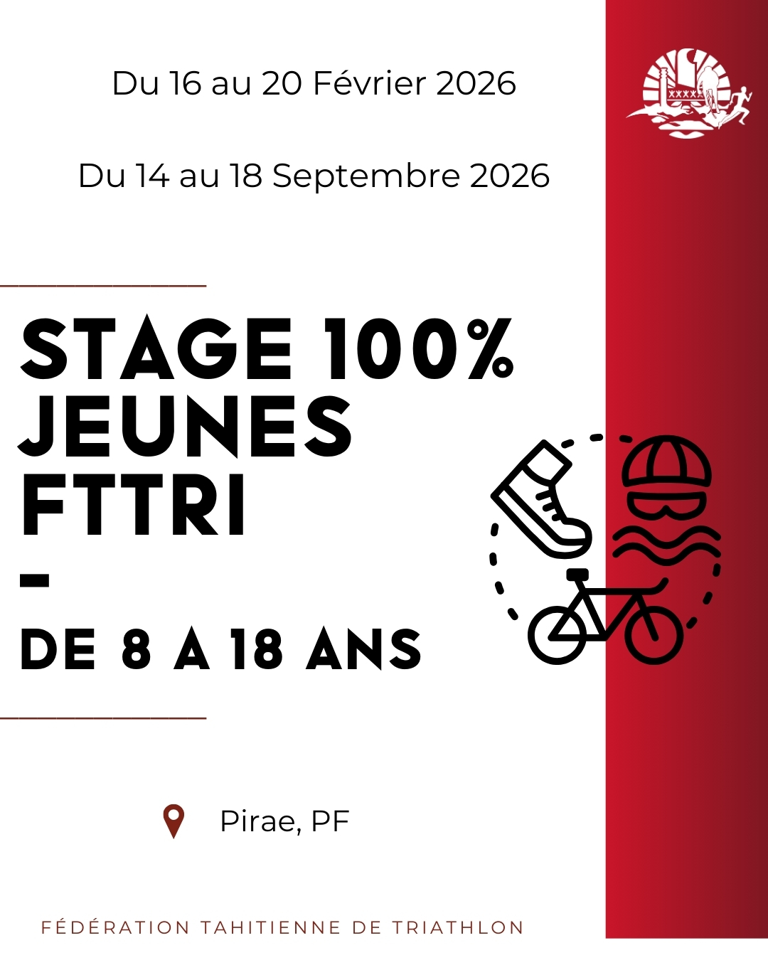 Organisé par la Fédération Tahitienne de Triathlon, ce stage est ouvert, à n’importe quel niveau de pratique, aux licencié(e)s des clubs et aux non-licencié(e)s à partir de 8 ans jusqu’à 18 ans. Au programme de ce stage, initiation et/ou entraîenment aux trois disciplines du triathlon (natation, vélo et course à pied) encadré par des entraineurs diplômés d’état et découverte d’autres sports ou activités culturelles. Plusieurs groupes seront créés (enfants/ados) et adaptés au niveau de chacun.